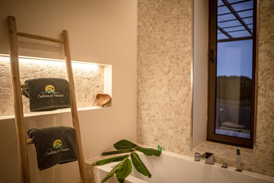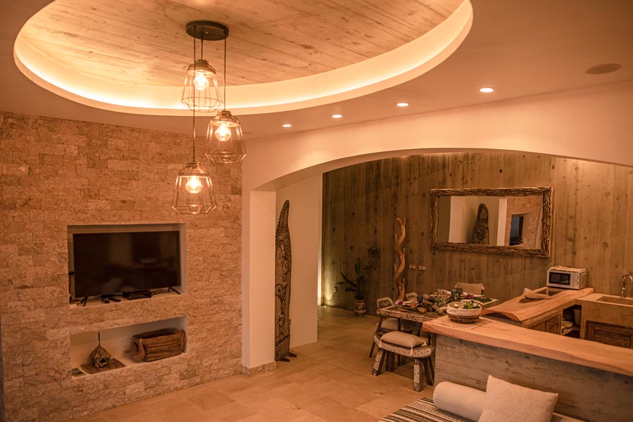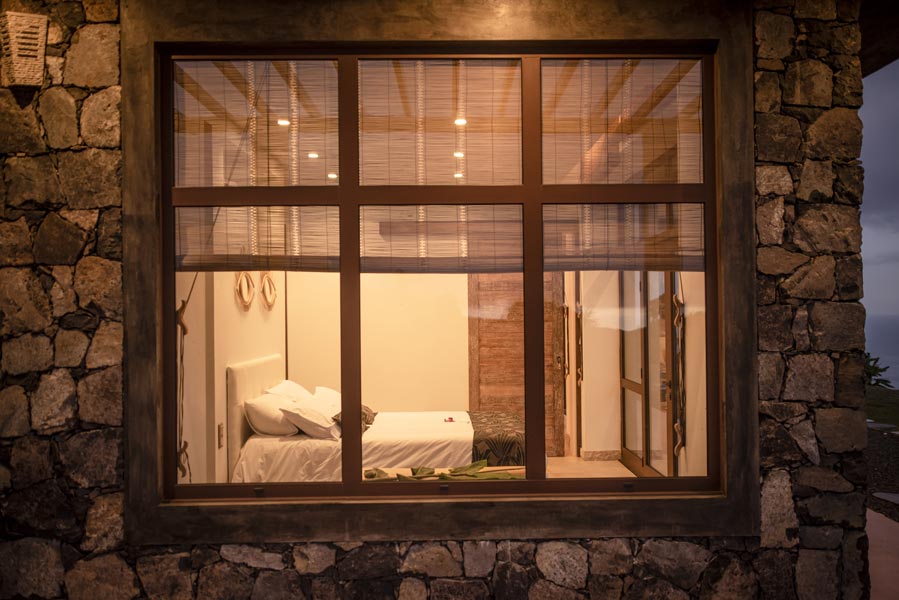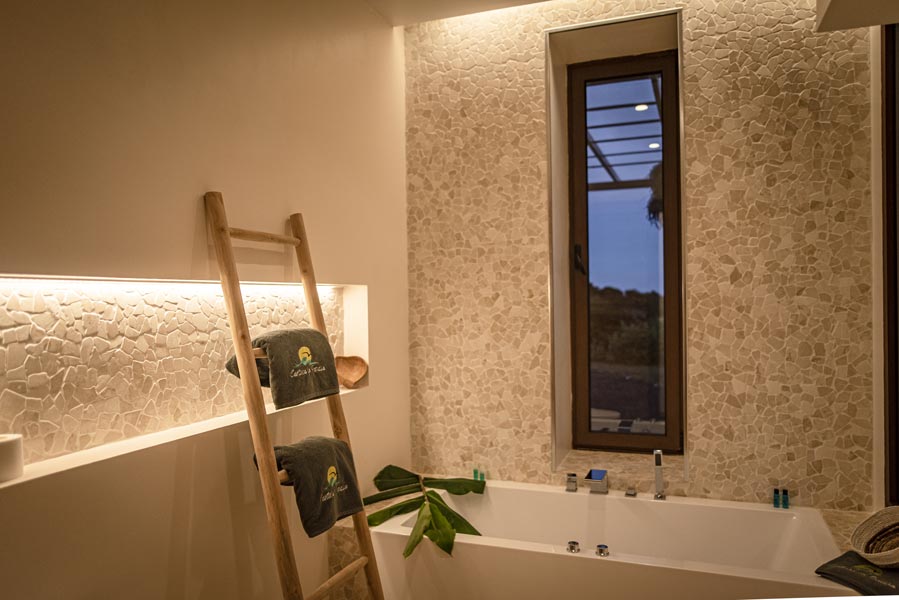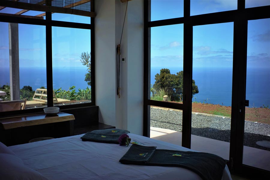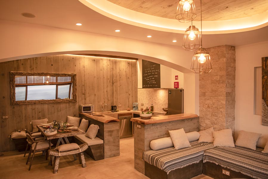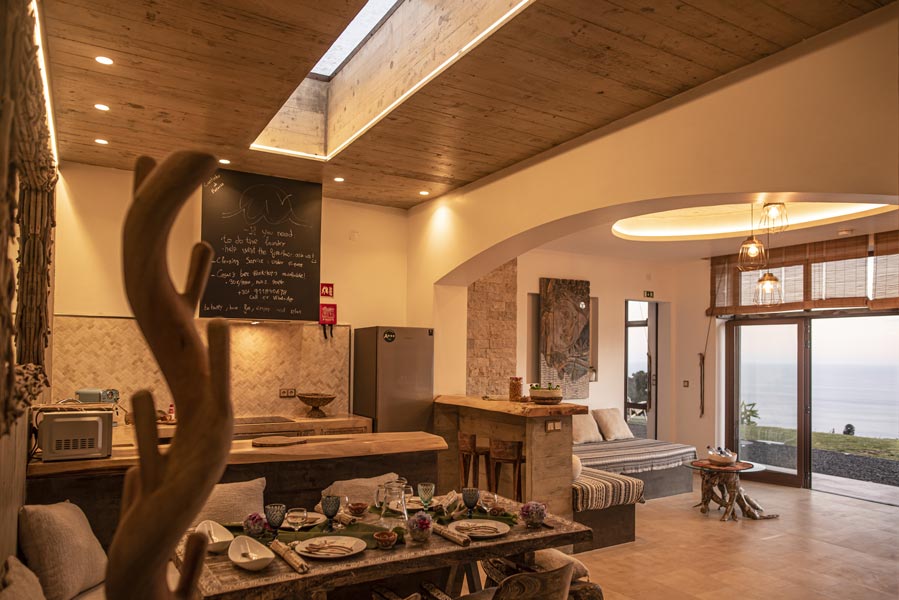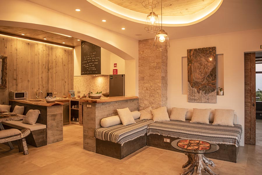 The kitchen comes with all you need to make your own meals, with an oven, large fridge, kettle, toaster, juicer, blender and microwave. There’s a tea station where you can make infusions from medicinal plants found only on the island. A large dining table with a sofa and chairs allows for wonderfully relaxed meals.