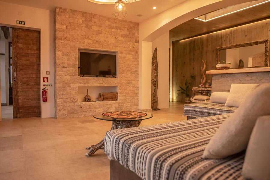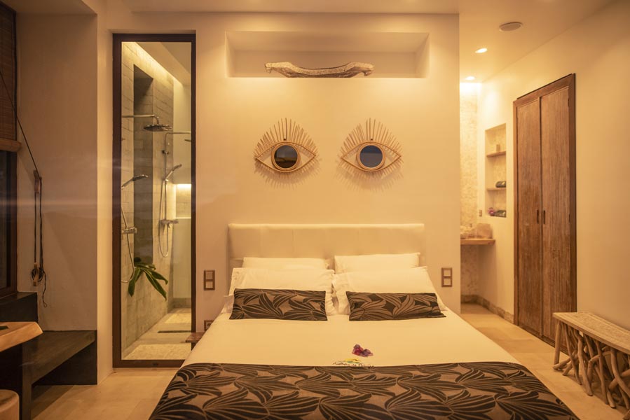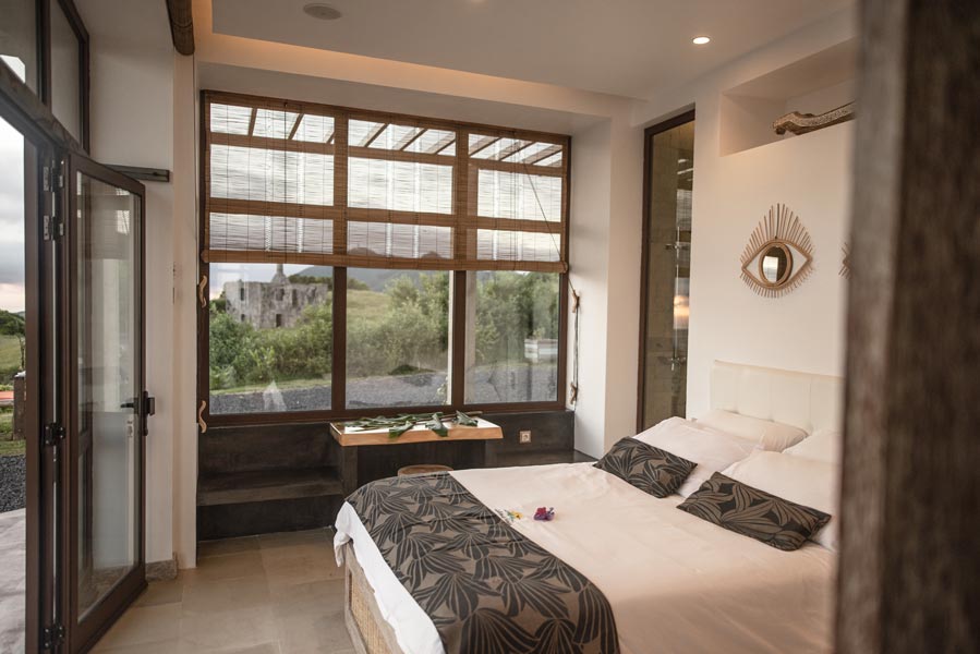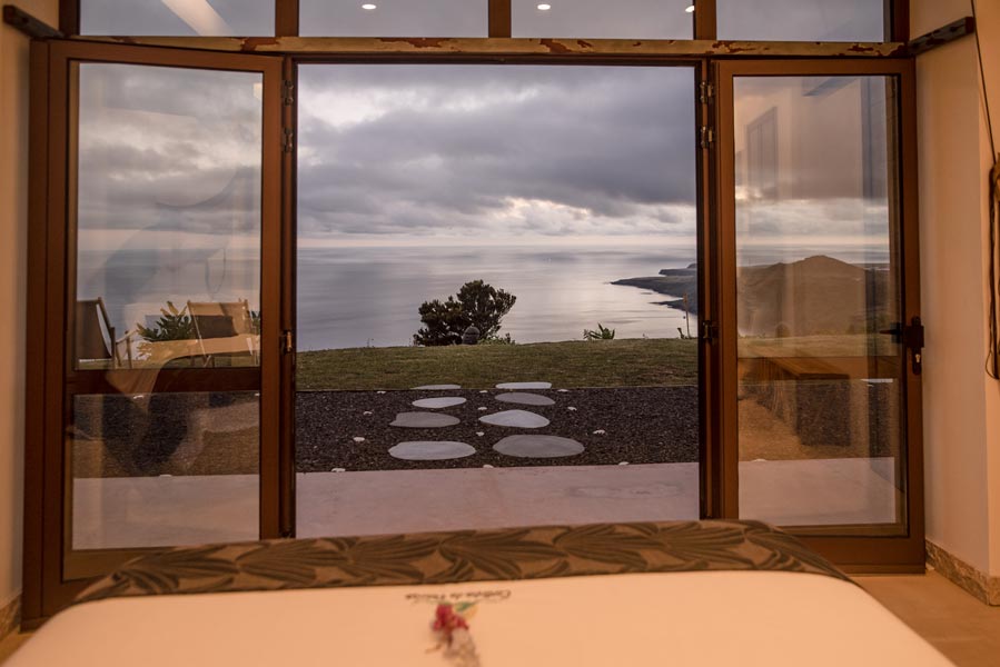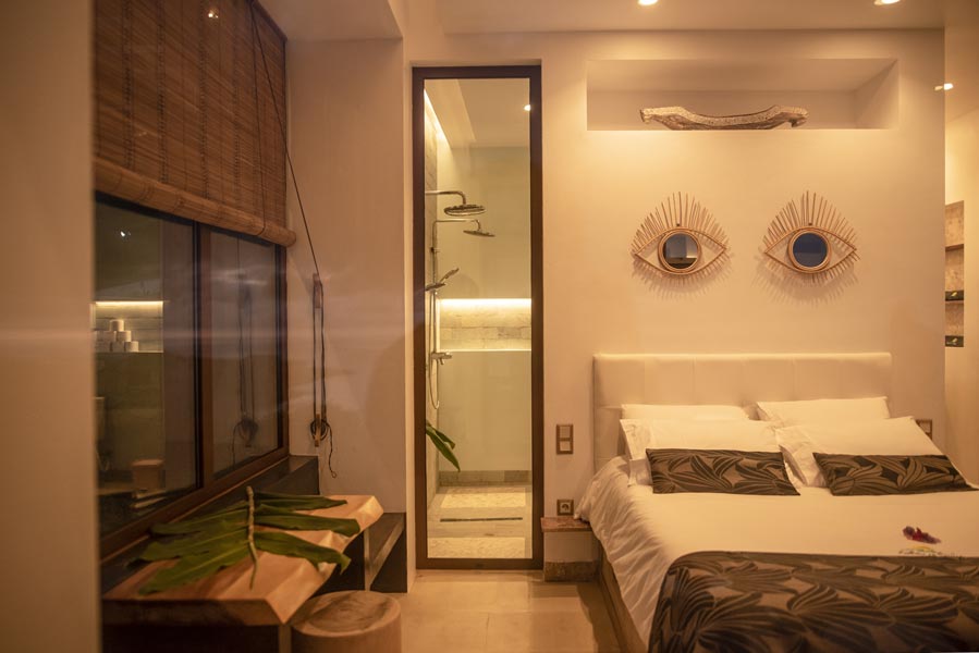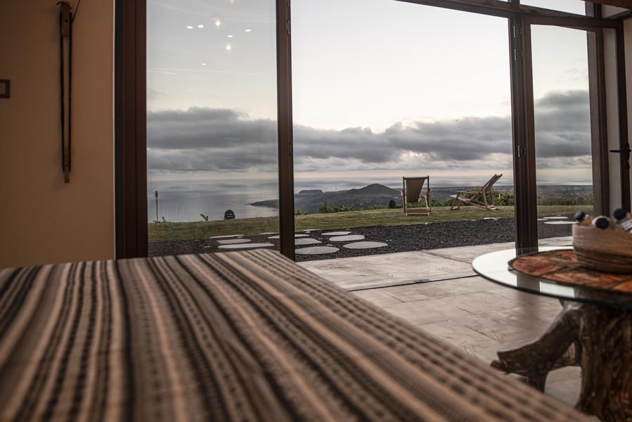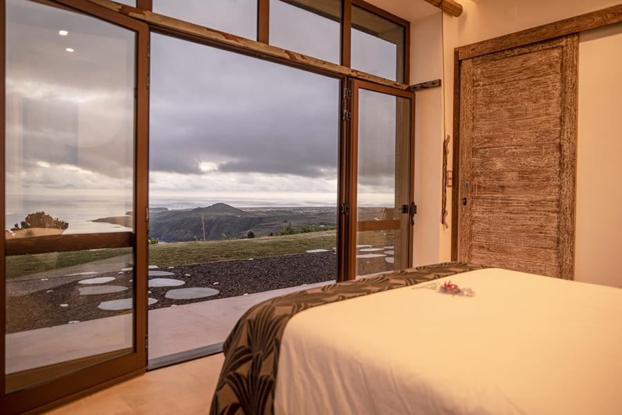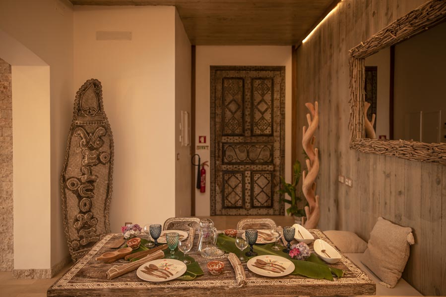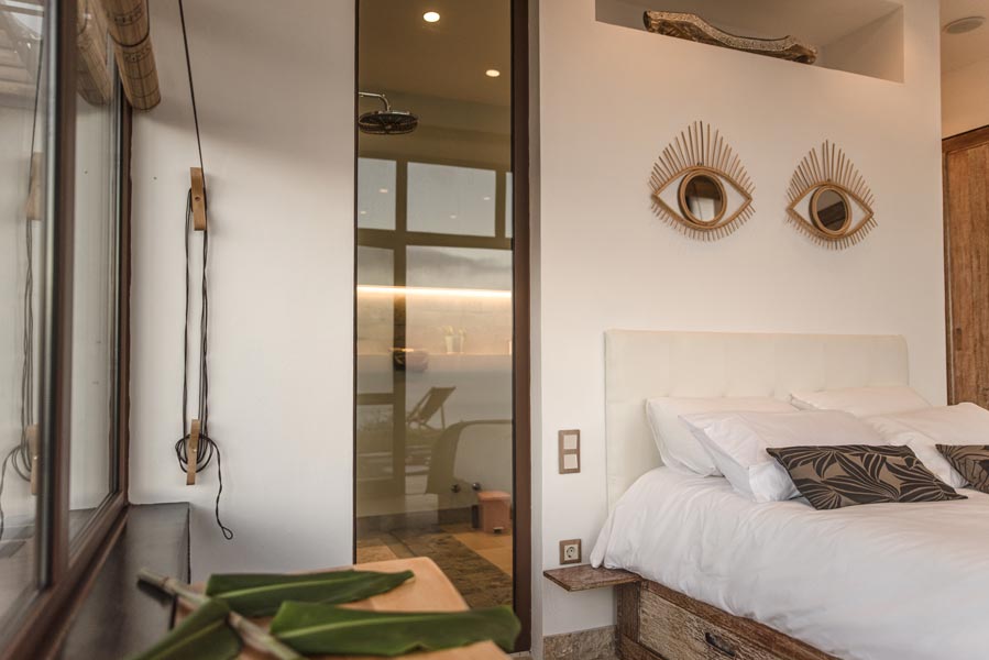 The kitchen comes with all you need to make your own meals, with an oven, large fridge, kettle, toaster, juicer, blender and microwave. There’s a tea station where you can make infusions from medicinal plants found only on the island. A large dining table with a sofa and chairs allows for wonderfully relaxed meals.