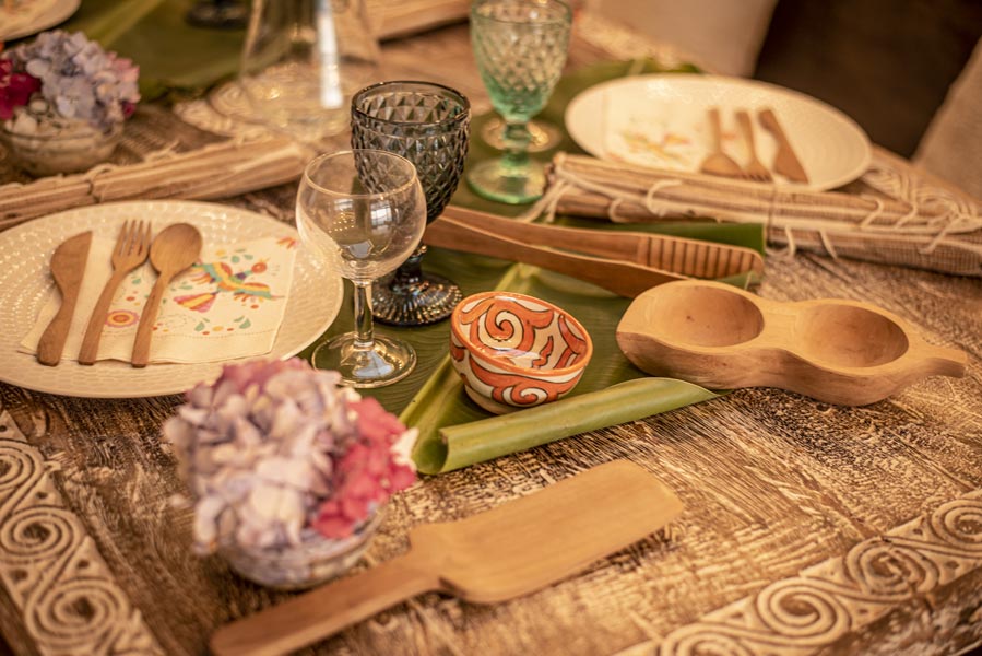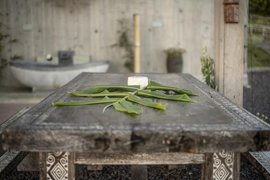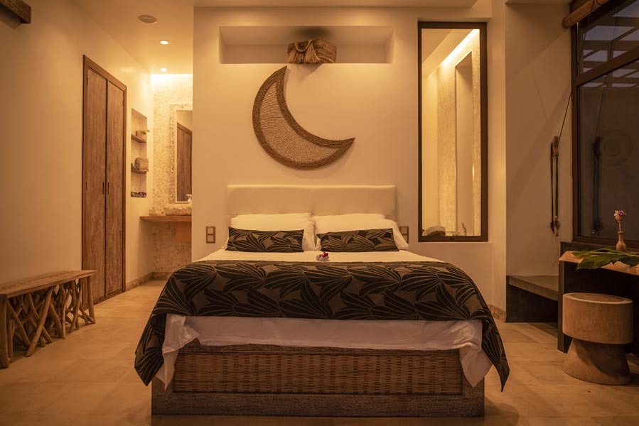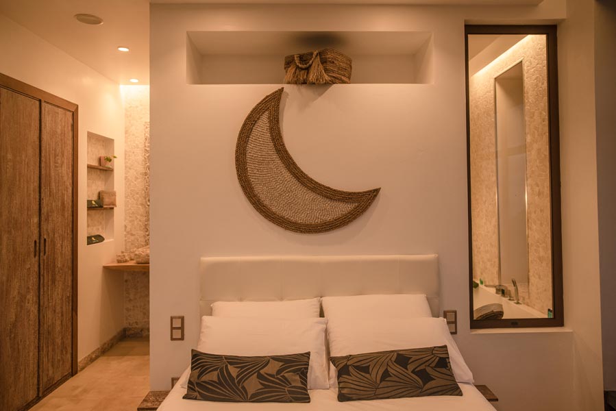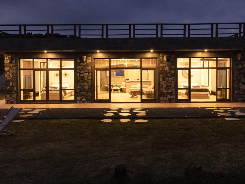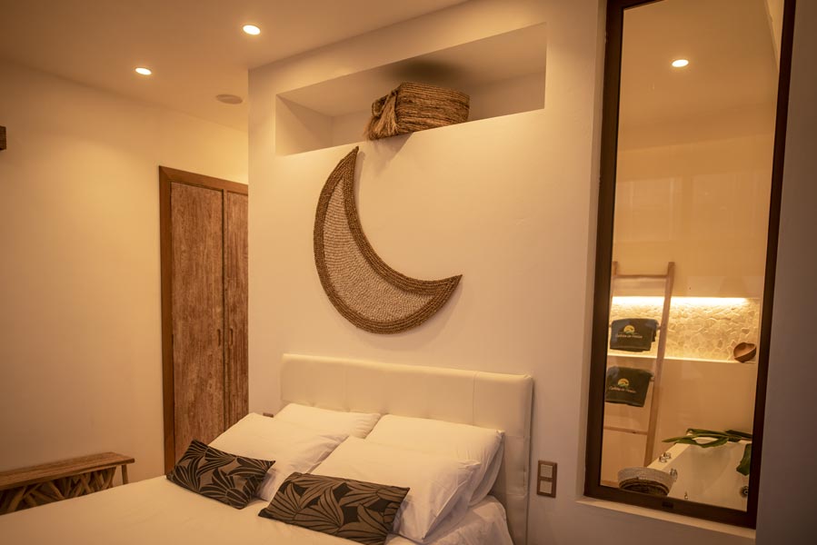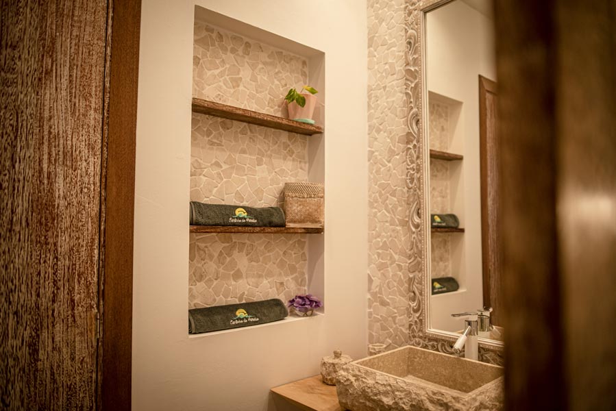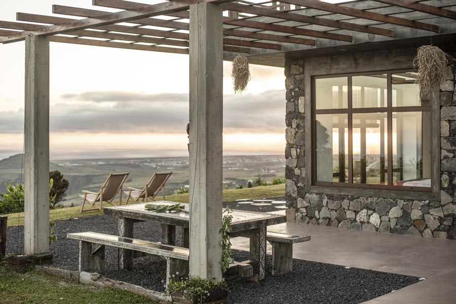 The kitchen comes with all you need to make your own meals, with an oven, large fridge, kettle, toaster, juicer, blender and microwave. There’s a tea station where you can make infusions from medicinal plants found only on the island. A large dining table with a sofa and chairs allows for wonderfully relaxed meals.