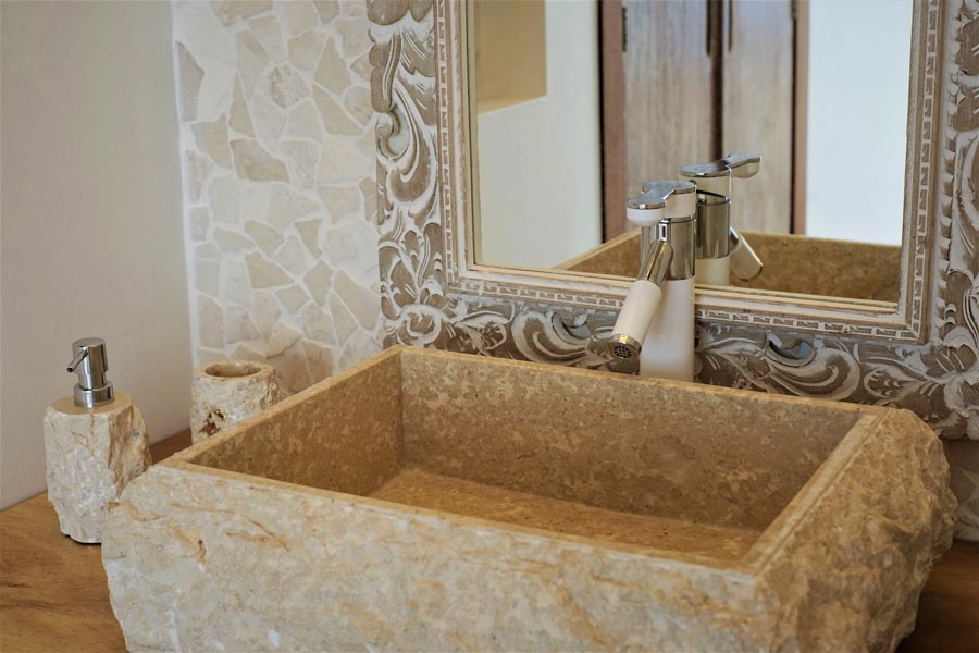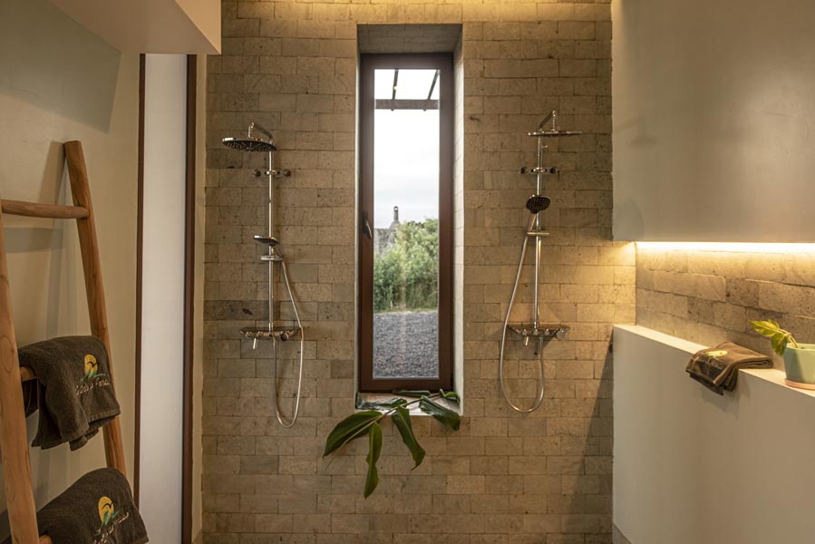 Both of the two bedrooms have large beds with extra-comfort mattresses, ample wardrobe space, wooden work desks, and a selection of relaxing music. Bedroom one has a private bathroom with a large Jacuzzi with bedroom two having a large double shower. Both have rock wash basins and a selection of free artisan toiletries.